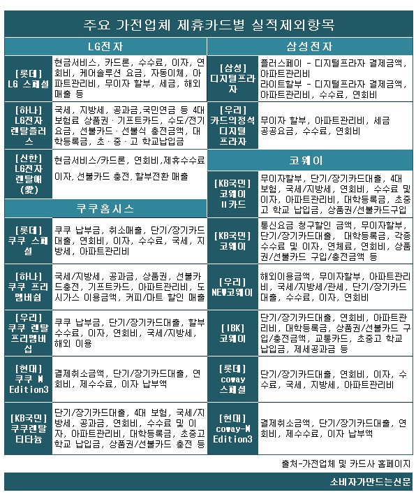 삼성전자와 LG전자, 코웨이, 쿠쿠홈시스 등 가전제품 업체들은 소비자와 '자동이체 및 전월실적 충족'을 조건으로 제휴카드를 운영한다.