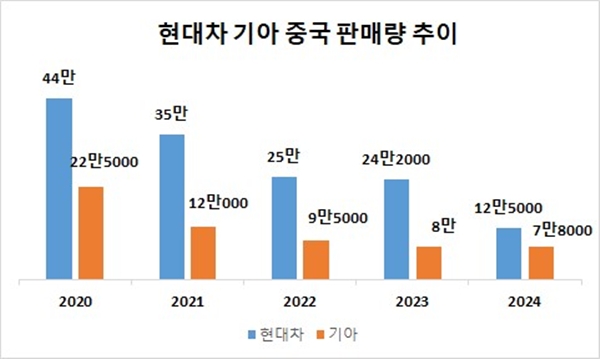 현대차의 지난해 판매량은 12만5000대로 2020년 44만대 대비 71.6% 감소했다. 기아는 7만8000대를 기록해 65.3% 줄었다. 현대차의 중국 시장 점유율은 2.3%에서 0.6%, 기아는 1.1%에서 0.3%로 하락했다. 현대차와 기아의 판매량과 시장 점유율이 불과 5년 만에 절반 이하로 떨어졌다.