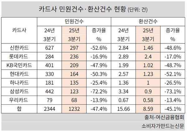 31일 여신금융협회에 따르면 올해 3분기 7개 카드사의 총 민원건수는 1232건으로 전년 동기 대비 47.4% 감소했다. 회원 10만 명당 민원건수를 의미하는 환산건수도 15.66건에서 8.59건으로 45.1% 줄었다.