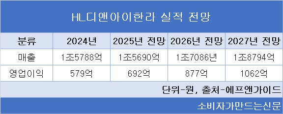 수주잔고를 바탕으로 HL디앤아이한라는 2026년부터 실적 성장세를 이어갈 전망이다. 2020년부터 올해까지 매출이 1조5000억 원 안팎에서 정체됐지만 내년에는 1조7000억 원, 2027년에는 1조9000억 원에 육박할 것으로 보인다.