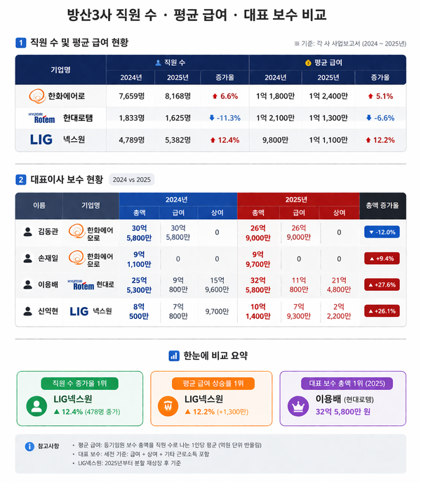 LIG넥스원 역시 급여와 인력 모두 증가세를 보였다. 직원 평균 급여는 1억1100만 원으로 전년 대비 12.2% 상승하며 처음으로 1억 원을 넘어섰다. 직원 수 또한 5382명으로 12.4% 증가해 방산3사 가운데 가장 높은 증가율을 기록했다.