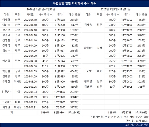 14일 전자공시시스템에 따르면 올해 들어 지난 13일까지 자기회사 주식 매수에 참여한 유한양행 임원은 14명이다. 이들은 5억2249만 원 규모의 5390주를 매입했다.