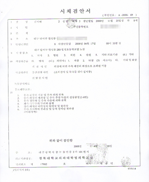 "학교측과 보험회사에 이어 이번엔 병원이 우리 아이를 세번이나 죽인 셈입니다. 문명국가의 학교와 보험회사,병원이 이런 행위를 할 수 있습니까?"