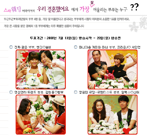 이미 ‘일요일 일요일 밤에’ 홈페이지에는 투표 진행을 위한 페이지가 마련돼 있다. 1번은 ‘진짜 같은 부부. 앤디와 솔비’, 2번은 ‘마니아층 개미와 마녀부부, 크라운제이와 서인영’, 3번은 ‘연상연하 트렌드 부부, 김현중과 황보’, 4번은 ‘영원한 로망, 로맨티스트 부부 알렉스와 신애’다.