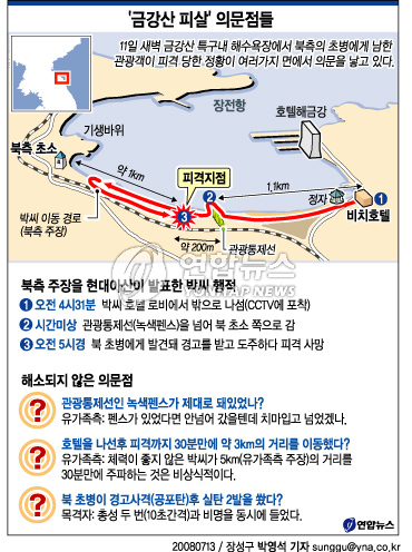 또 이씨가 중년 여성이 북쪽으로 '걸어' 올라간 것을 본 뒤 총성을 들을 때까지 시간 간격은 불과 5∼10분 정도에 불과해 이 사이 박씨가 관광통제선 울타리에서 1.2km 떨어져 있는 북측 초소까지 걸어갔다 다시 1㎞를 뛰어서 돌아올 수 있었는지도 의문으로 남는다.