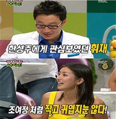한성주는 “내가 조여정씨처럼 귀엽지는 않지만 꽤 괜찮은 구석이 많다”며 드러내놓고 이휘재에게 관심을 표현했고 녹화에 출연한 다른 연예인들도 이를 부추기며 분위기를 몰아갔다.