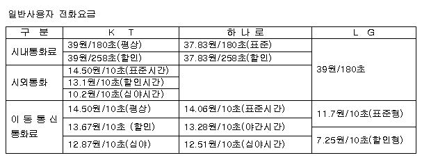 일반적으로 ARS 대표번호의 경우 유선전화 시내요금은 180초 이용시 39원(표준), 이동전화는 10초당 14.5원(주간)이 부과된다. 일반 전화와 크게 다르지 않다. KT의 경우 시내전화, 이동통신은 일반 소비자 요금과 동일하다. 시외전화만 미세하게 조정했다. 하나로텔레콤 은 시내전화 요금만 미세한 정도로 낮게 책정했다. 조정액이 너무 미세해서 인하율을 계산할수도 없는 수준이다.<표 참조>