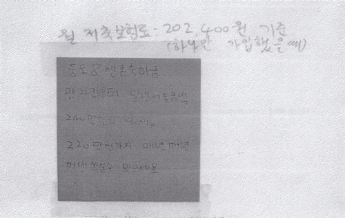 가입 당시 이모씨는 설계사로부터 "납입 2년 후부터는 자유롭게 꺼내 쓸 수 있다"는 설명을 들었고, '중도 & 생존축하금으로 만 2년후부터 1년간 불입한 원금의 90%까지 매년 꺼내 쓸 수 있다'라는 메모<사진>까지 받았다. 메모에는 "중도&생존 축하하금 만2년부터 일년 저축금액 240만원의 90%,220만원까지 매년 매년 꺼내 쓸 수 있으세요"라고 명기돼 있다.