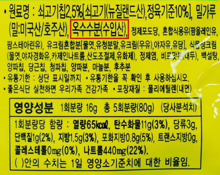 지금까지는 유전자변형이 아닌 중국산이 들어왔는데, 이제부터는 중국산이 안들어오고 유전자변형 옥수수분이 들어온다고 그렇게 들었는데.....그니깐 옥수수분 들어있는건 다 유전자 변형인거죠~