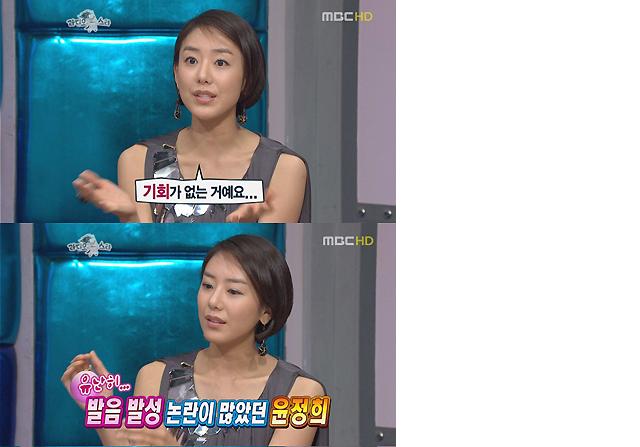 윤정희는 지난 23일 방송된 MBC '황금어장-라디오스타'에 출연해 '연기를 하면서 제일 힘들었던 때'를 묻는 MC들의 질문에 "고생이라기보단 서운했었던 적이 있었는데 너무 정형화된 발음발성법으로 나를 판단해 논란이 일었던 때다"고 밝혔다.