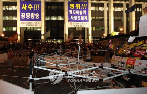 네티즌들은 지난 6월 11일 KBS에 대한 감사원의 특별감사에 반대하는 촛불집회를 열면서 천막농성을 시작했으며 이에 맞서 촛불시위에 대한 KBS 보도에 항의하는 보수단체 회원들도 이달 2일부터 천막을 설치하고 매일 맞불 집회를 벌여왔다.
