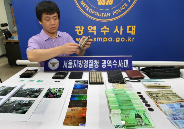 24일 경찰 관계자가 광역수사대에서 할머니 소매치기단이 훔친 물건 등을 살펴보고 있다.