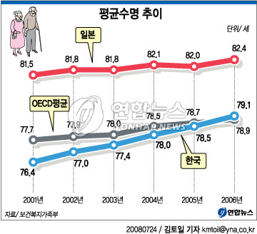 URL복사 기사공유하기 스크랩 프린트 메일보내기 글씨키우기 24일 보건복지가족부가 공개한 '2008 OECD 건강데이터'에 따르면 2006년 기준으로 한국인의 평균 수명은 79.1세로 OECD 국가 평균수명 78.9세를 0.2세 앞질렀다.세계 최고의 장수국인 일본을 바짝 추격하고 있다. 저작권자 © 소비자가 만드는 신문 무단전재 및 재배포 금지 뉴스관리자 다른기사 보기 URL복사 기사공유하기 주요기사 김동연 경기도 지사 "용인반도체 전력망 마지막 퍼즐 완성" 골드바 홈쇼핑서 사면 10~40% 비싸...사은품 등 혜택 '자가부담' 불과 쿠팡 사태 이후 지마켓·컬리 이용자 급증 반사이익 한국거래소 주식 거래시간 연장 놓고 노조 저항…인프라 구축도 걸림돌 삼성그룹 상장사 주가 희비…삼성전자 두배 이상↑, 호텔신라 '부진' [따뜻한경영] 유한킴벌리, 국내 유일 '이른둥이' 기저귀 생산…무상 공급