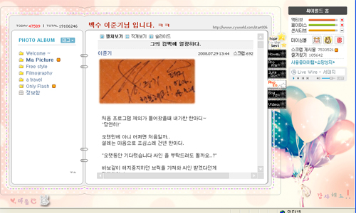 이어 그는 "오랜만에 아니 어쩌면 처음일까. 설레는 마음으로 조심스레 건넨 한마디. '오랫동안 기다렸습니다. 싸인을 부탁드려도 될까요? 바보같이 애지중지하던 브릭을 가져와 싸인을 받겠다던 게 깜빡했었다. 핸드폰 케이스에 받은 싸인~"이라며 서태지에게서 받은 사인을 미니홈피에 공개하고 있다.