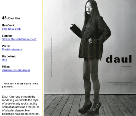 지난 2월 뉴욕 컬렉션을 마치고 'NY magazine'이 선정한 '주목 해야 할 모델 탑 10' 중 5위에 오르기도 했던 김다울은 2007년 F/W 시즌을 시작으로 뉴욕, 파리, 런던, 밀라노 컬렉션에 진출해 불과 2년만에 45위에 올랐다.