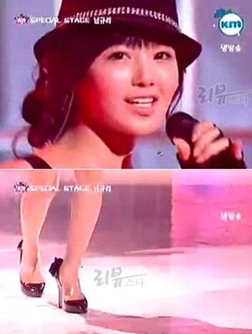 남규리는 이날 방송에서 엄정화의 히트곡 '포이즌'을 재연했다. 그런데 검정색 구두를 신은 남규리의 발에 조명을 받아 반짝이는 테이프가 보였다.
