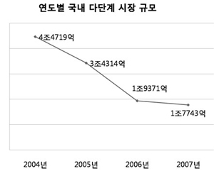지난해 국내에 등록된 다단계 판매업체 65개사의 매출 총액은 1조7743억원. 지난 2006년보다 회사는 2개사가 줄었고 매출은 9.2% 감소했다.