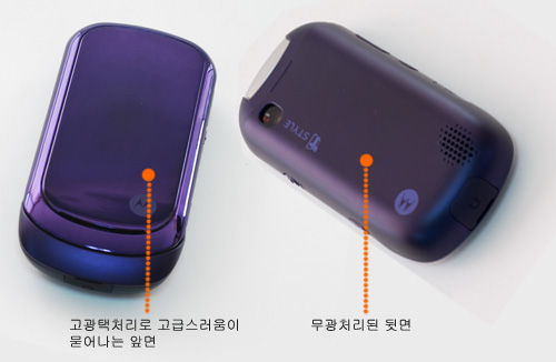 출고가 48만8400원의 이 짙은 보라색의 조약돌은 주머니에서 혹은 가방에서 꺼내면서부터 사람들의 시선을 사로잡기에 충분해 보인다. 곡선 마무리를 통한 고급스러움에 모토로라 특유의 심플함을 살려 디자인만으로도 크게 어필 하고 있다. 이에 더해 ‘히든 디스플레이’라는 ‘히든카드’까지 겸비하면서 유저들의 호응이 더 한층 더할듯 하다.