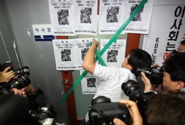 URL복사 기사공유하기 스크랩 프린트 메일보내기 글씨키우기 11일 이명박 대통령이 정연주 KBS 사장을 해임한 가운데 서울 여의도 KBS 사옥에서 KBS 직원들이 정연주사장의 해임제청안 통과 때 경찰력을 본관으로 끌어들인 이사회를 규탄하며 이사회 사무실을 봉쇄하고 있다.(사진=연합뉴스) 저작권자 © 소비자가 만드는 신문 무단전재 및 재배포 금지 뉴스관리자 다른기사 보기 URL복사 기사공유하기 주요기사 삼성증권, 지난해 순이익 1조84억 원…주당 배당금 4000원 결의 [인사] 금융위원회 김동연 지사, 용인 반도체 현장 방문…"든든한 지원군이 되겠다" 에스티팜, 5600만 달러 규모 원료 공급계약 체결 KB금융, 1조 2000억 원 규모 자사주 861만 주 소각 보람의정부장례식장, 의정부성모병원과 MOU 체결...장례서비스 지원