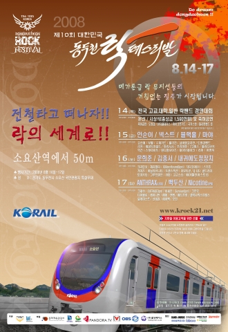 코레일(사장 강경호)는 오는 14일부터 4일 동안 경원선 소요산역 근처에서 열리는 ‘제 10회 대한민국 동두천 락 페스티벌(Rock Festival)’에 관람객의 이용편의를 위해 축제 마지막날(17일) 임시전동열차를 투입한다고 11일 밝혔다.