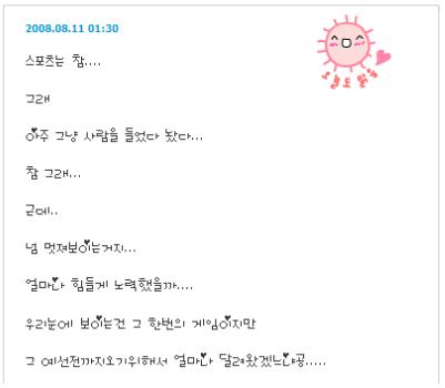 채연은 11일 자신의 미니홈피에 "스포츠는 아주 사람을 들었다 놨다 한다'며 '얼마나 힘들게 노력했을까. 우리 눈에 보이는 건 그 한번의 게임이지만 그 예선전까지 오기 위해서 얼마나 달려왔겠느냐고. 금메달이 좋고 기쁘기야하지만 지금 이순간 우리를 하나로 만들어주고 힘찬 함성으로 대한민국을 외칠 수 있게 해준 그들이니까 결과가 어떻든 앉아서 야유를 하면 안되는거야'라며 소감을 밝혔다.