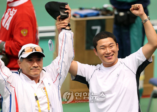 <사진 = 연합뉴스 :2008베이징올림픽이 계속된 12일 베이징사격관에서 열린 남자 50m 권총 결승에서 금메달을 딴 진종오가 김선일 감독과 함께 관중석을 향해 환호하고 있다>