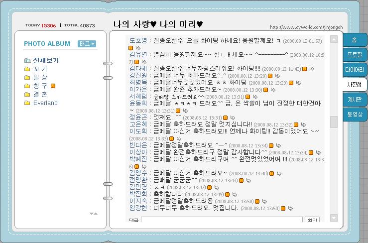 네티즌들은 “아테네 올림픽 때 너무 아쉬웠는데 이번 금메달 정말 축하한다”는 내용의 글을 남기며 환호하는 것과 동시에 진종오의 미니홈피가 사랑이 넘친다며 호응의 댓글을 남기고 있다.
