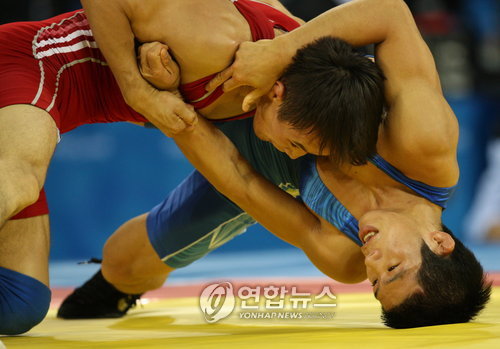 <사진 = 연합뉴스 : 12일 베이징 중국농업대학 체육관에서 열린 베이징올림픽 그레코로만형 60㎏급 16강전에서 정지현(아래)이 벨로루시 유리 두비닌과 접전을 벌이고 있다. 정지현은 8강전에서 누르바키트 텐기즈바예프(카자흐스탄)에 1-2로 패했다>