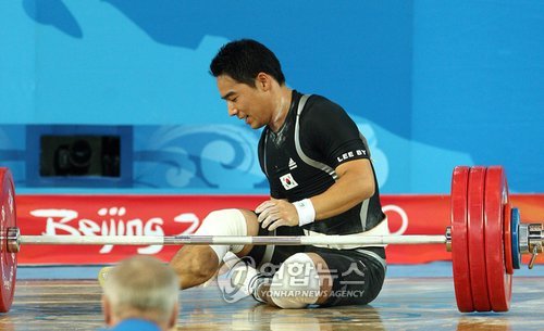 <12일 베이징 항공항천대에서 열린 베이징올림픽 남자 역도 69kg급에 출전한 이배영이 용상 1차 시도에서 넘어지며 부상을 입고 있다.>