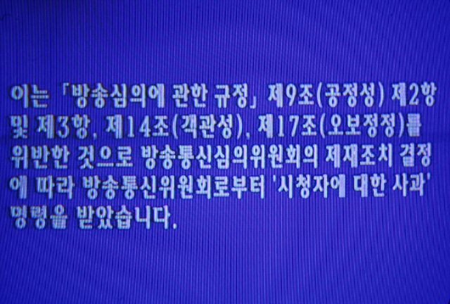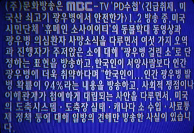 URL복사 기사공유하기 스크랩 프린트 메일보내기 글씨키우기 MBC가 'PD수첩'의 광우병 관련 보도에 대한 방송통신위원회의 '시청자에 대한 사과' 이행명령을 수용해 12일 밤 사과 방송을 하고 있다. 저작권자 © 소비자가 만드는 신문 무단전재 및 재배포 금지 뉴스관리자 다른기사 보기 URL복사 기사공유하기 주요기사 삼성증권, 지난해 순이익 1조84억 원…주당 배당금 4000원 결의 [인사] 금융위원회 김동연 지사, 용인 반도체 현장 방문…"든든한 지원군이 되겠다" 에스티팜, 5600만 달러 규모 원료 공급계약 체결 KB금융, 1조 2000억 원 규모 자사주 861만 주 소각 보람의정부장례식장, 의정부성모병원과 MOU 체결...장례서비스 지원