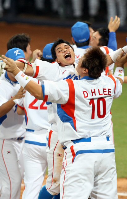 13일 오후 베이징 우커송야구장에서 열린 올림픽 야구 한국과 미국의 경기에서 극적인 역전승을 거둔 후 결승타를 친 이종욱과 투런 홈런을 친 이대호 등 선수들이 환호하고 있다.