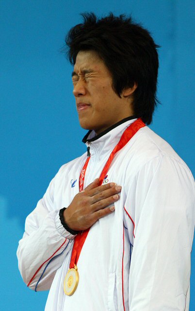 사재혁이 13일 베이징 항공항천대 체육관에서 열린 베이징올림픽 남자 역도 77kg 급에 출전해 우승한 뒤 시상대에서 흐르는 눈물을 애써 참고 있다.(사진=연합뉴스)