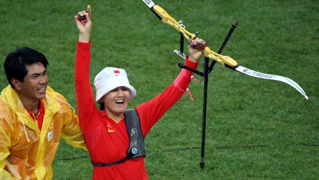 14일 열린 양궁 여자 개인 결승에서 한국의 윤옥희와 박성현을 연달아 이기고 중국 양궁의 숙원을 이룬 장쥐안쥐안이 환호하고 있다.