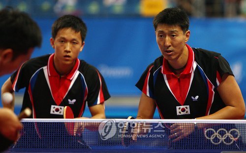 18일 베이징대 체육관에서 열린 남자 탁구 단체전 동메달 결정전에 나선 유승민(26·삼성생명)·오상은(31·KT&G)·윤재영(25·상무)은 상대 오스트리아를 3대1로 꺾고 승리했다.