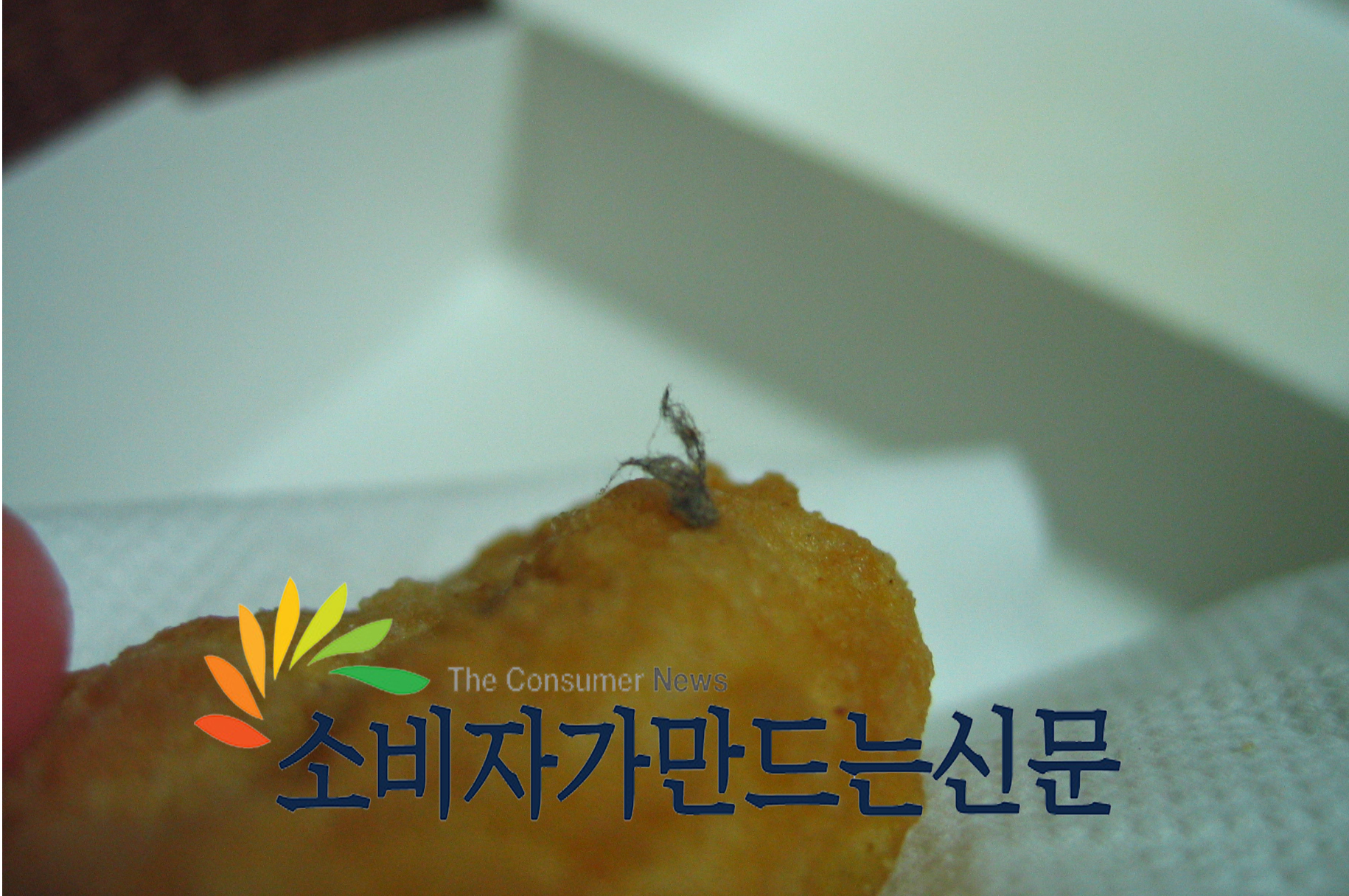 서울 망원동의 봉모씨는 지난 11일 8살 딸아이와 함께 맥도날드 망원점를 방문해 햄버거와 맥너겟을 구매했다.봉씨의 딸아이가 맥너겟을 먹던 중 회색빛의 털처럼 보이는 이물질이 너겟에 박혀있는 걸 발견했다.