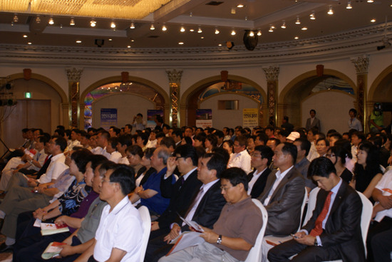 <설명회에 쏠린 뜨거운 열기...인천오토갤러리 사업설명회장을 찾은 분양 신청자들이 투자가치에대한 설명을 주의깊게 경청하고 있다>