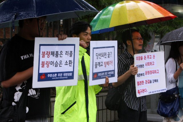 서울 광진구의 10여개 단체와 인터넷포털 다음의 '주민소환추진 국민모임' 카페 회원들이 22일 오후 서초동 서울중앙지방법원 앞에서 기자회견을 갖고 서울시의회 의장 선거와 관련해 동료 시의원들에게 돈을 뿌린 혐의로 구속기소된 김귀환 서울시의회 의장에 대한 엄정한 판결을 촉구하고 있다.