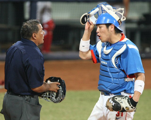 23일 오후 베이징 우커송야구장에서 열린 2008베이징올림픽 야구 결승 한국 대 쿠바 경기에서 9회말 1사 만루 강민호가 볼넷 판정에 대해 심판에게 항의하고 있다.곧바로 퇴장을 당했다.