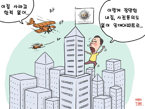 "엄청난 대출이자까지 물어가며 2억5000만원주고 어렵게 집 하나 마련했는 데 어느날 갑자기 임대아파트와 일반 아파트를 섞어 놓은 '혼혈' 아파트 단지가 돼 버렸습니다"