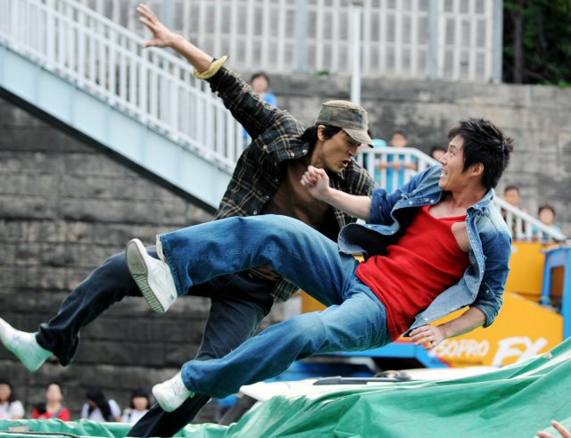 장혁과 김민준은 스턴트맨이 와이어를 달고 뛰어내리는 시범을 보고 곧 바로 와이어를 몸에 묶고 뛰어내려 부산시민의 환호를 받았다.