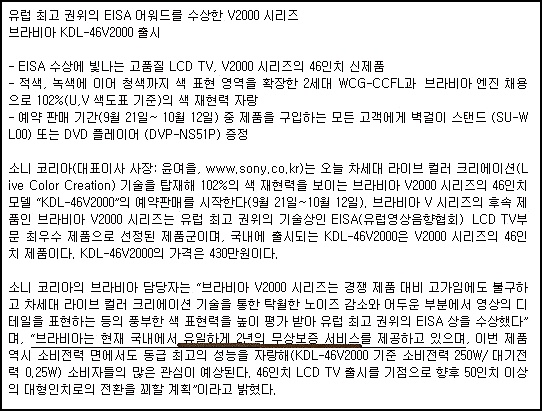 <한 인터넷 사이트에 게재된 소니 TV 'KDL46V2000' 홍보 문구>