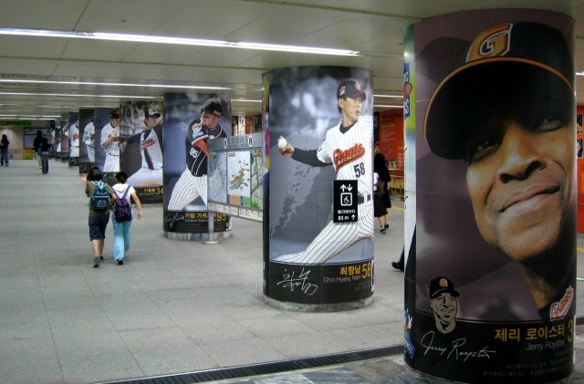 롯데 로이스터 감독과 최향남, 가르시아, 이대호 등 롯데 선수들의 대형 사진과 야구단 마스코트 등으로 꾸며진 부산 지하철 3호선 종합운동장역 대합실이 시민들의 눈길을 끌고 있다.