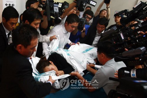정선희는 병원에서 안정을 취하며 경찰의 참고 조사를 마친 뒤 9일 새벽 앰뷸런스로 안재환의 빈소에 도착했다.