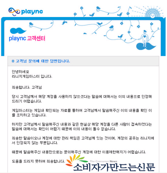 그러나 "NC소프트측은 '계정에 대한 관리 책임은 고객에게 있는 것이며, 계정의 공유는 NC소프트가 인정할 수 없는 부분'이라고 일축했다"고 김씨는 전했다.