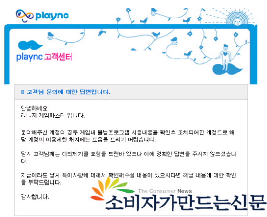 며칠 뒤 김씨는 NC소프트로 부터 “불법프로그램 사용을 확인했다”며 “특이사항을 말하라”는 답장을 받았다.