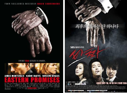 두 포스터 모두 검은 색 바탕에 양복을 입은 남자의 오른팔 손목을 왼손이 잡고 있는 이미지가 상단에 위치했고, 하단부에는 출연 배우들을 배치한 구성이 매우 흡사하다.