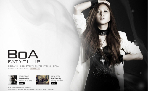보아의 영문홈페이지에는 보아의 경력을 볼 수 있는 바이오그래피와 디스코그래피, 사진과 비디오 코너로 구성되어 있으며 미국 데뷔곡 ‘Eat you Up'의 공개시기가 나와 있어 팬들의 기대감을 높이고 있다.