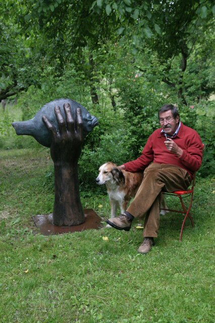 노벨문학상 수상자인 독일의 귄터 그라스가 자신의 작품 '손에 쥔 물고기 2' 옆에서 휴식을 취하고 있다. 오는 19~23일 서울 삼성동 코엑스에서 열리는 한국국제아트페어(KIAF)에 귄터 그라스의 드로잉과 조각들이 전시될 예정이어서 관심을 모으고 있다.