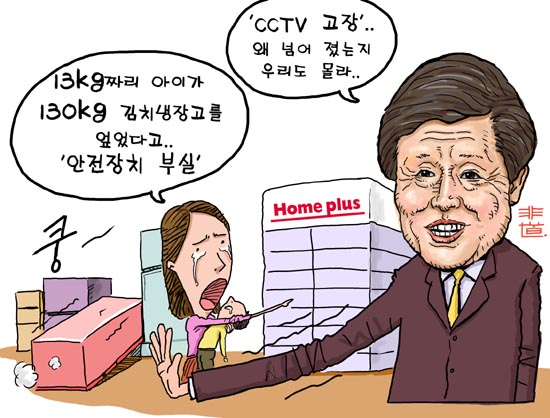홈플러스의 판매대에 전시된 대형 김치냉장고가 넘어져 30개월의 남자아이가 크게 다치는 사고가 발생했다.