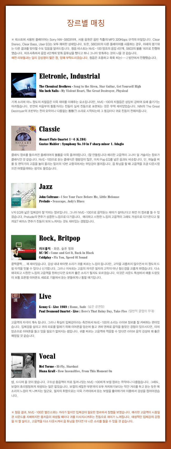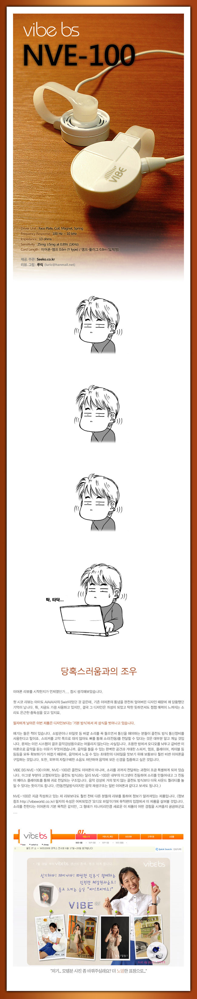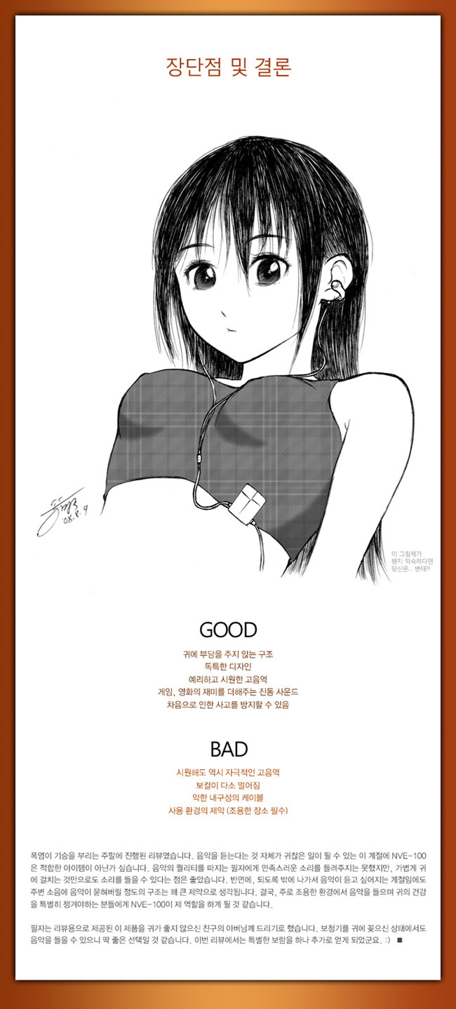 NVE-100은 별도 전원을 사용하며, 재생 시간 6시간 분량의 리튭 폴리머 배터리를 갖고 있습니다. (완전 충전 1시간 30분)이를 충전하기 우해서 별도의 어댑터가 제공되며 그냥 컴퓨터의 USB 단자에 연결해도 충전이 진행됩니다. 전원도 공급하지만 이 네모난 부품은 앰프 역할도 합니다. NVE-100으로 음악을 들으려면 플레이어의 볼륨을 2배 가까이 올려야하는데, 이 앰프가 없었다면...풀 볼륨으로 올려도 모자랄 지경이 아닐까 싶습니다. 어쨌거나~ 이 앰프 파트의 위쪽에는 전원 버튼이 있습니다. 이 버튼을 3초 정도 길게 눌러줘야 NVE-100의 전원이 켜지고 음악을 들을 수 있게 됩니다. 또한, 이 버튼을 짧게 누르면 4단계로 음압을 조절할 수 있습니다. 여기에서 음압이라고 표현한 이유는, 단순히 저항을 통해 볼륨값만을 조절하는 게 아니기 때문입니다. 이 앰프의 초대출력은 0.6W인데 1~4단계에 걸쳐 Gain값을 조절할 수 있습니다. (mW가 아님을 염두에 두시기 바랍니다)보통은 4단계로 사용하게 되며, 나머지 3단계는 장소에 따라 출력을 줄여서 사용할 수 있도록 만들어 졌다고 합니다.(예를 들면 도서관이 되겠지요)